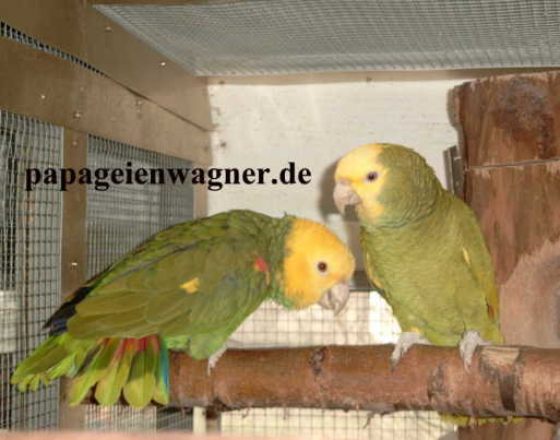 Gelbscheitelamazonen, Amazona ochrocephala Beschreibung: grün; Nackenfedern schwach schwärzlich gesäumt; Stirn, Zügel, Scheitel, gelegentlich Augenbereich und Schenkel gelb; Flügelbug rot; Flügelsaum gelbgrün; Hand- und Armschwingen an Außenfahnen und Spitzen violettblau; roter Flügelspiegel an äußeren fünf Armschwingen; Schwanz grün mit grüngelber Spitze; Basis der äußeren Schwanzfedern rot, Au-ßenfahnen mit blauem Saum; nackter Augenring weißlich; Schnabel grau mit rötlichen Oberschnabelseiten; Iris orange; Füße grau. Jungtiere mit weniger intensiver Färbung; nur Stirn und Vorderscheitel gelb; Nackenfedern mit deutlich schwärzlicher Säumung; Schnabel grau; Iris dunkel. Größe: 36 cm (Flügellänge 198 mm - 220 mm) Verbreitung: Süd- und Zentral-Kolumbien östlich der Anden und ihrer Ausläufer über Venezuela (hier nicht in den küstennahen Gebieten Bolívars) über Guyana, Französisch-Guayana und Surinam bis zum Rio Tapajós, Pará, Nord-Brasilien; Trinidad. Lebensraum: alle Arten von Gebieten mit Baumbestand in der trockenen und feuchten tropischen und subtropischen Zone bis 750 m Höhe; daneben auch Savannen und Gebiete mit hohem Buschbestand; hält sich bevorzugt an Waldrändern auf: regelmäßig in Anbaugebieten, Kaffeeplantagen, in und bei Dörfern zu beobachten. In Menschenhand: laute Papageien; werden bald zutraulich; lebhaft; Nagebedürfnis ausgeprägt; baden gern; außerhalb der Brutzeit gegenüber anderen Amazonen verträglich; auch während Eingewöhnungszeit robust. Ernährung: Samenmischung aus Kardi, Weizen, Hafer, Milo, Dari, Hanf, getrockneten Ebereschenbeeren, Buchweizen und Mungobohnen; gekeimte Sonnenblumenkerne; wenige Zirbelnüsse; verschiedene Obst- und Gemüsesorten; halbreifer Mais, Hagebutten, Grünpflanzen; regelmäßig Mineralstoffgaben. Zucht: mehrfach gelungen, insbesondere von oratrix und panamensis; Paar unbedingt allein halten; Brutbeginn bevorzugt im April, aber auch den ganzen Sommer über; Männchen inspiziert Nistkasten, bevor Weibchen hineingeht; 2 bis 4 Eier; Brutdauer 26 Tage; Nestlingszeit 60 Tage; Nistkasten 30 cm x 30 cm x 50 cm; zuvor zahme Vögel sind während der Brut äußerst aggressiv; wenn Pfleger nicht erreicht werden kann, wird Aggressivität oft auf Partner umgelenkt; verhältnismäßig häufig werden von unerfahrenen Jungpaaren die Eier der ersten Brut zerstört oder Jungtiere nicht gefüttert.
