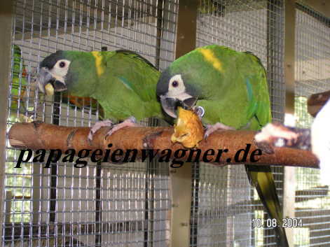 Hahn´s Zwergaras, Diopsittaca nobilis Beschreibung: grün; Stirn und vorderer Scheitel dunkelblau; Flügelbug, Flügelsaum und große Unterflugeldecken rot; Außenfahnen der äußeren Handschwingen blau; Schwanz- und Flügelunterseite olivgelb; nackter Bereich um Auge und Zügel weißlich; Schnabel dunkelgrau; Iris braunrot; Füße dunkelgrau. Jungtiere ohne Blau auf Stirn und Scheitel; Rot weniger ausgedehnt; Schnabel hornfarben. Größe: 30 cm (Flügellänge 163 mm - 177 mm) Verbreitung: Guyana, Surinam, Französisch-Guayana, Ost-Venezuela und Brasilien nördlich des Amazonas in den Staaten Roraima und Para. Lebensraum: offene Waldgebiete, Savannen mit angrenzenden Waldgebieten; Caatinga-Gebiete Palmenhaine, Ränder von Regenwäldern; fällt gelegentlich in Plantagen ein. In Menschenhand: mittellaute bis laute Aras mit gelegentlich stark ausgeprägtem Nagebedürfnis; anfangs scheu und nervös, gewöhnen sich jedoch meist bald an Pfleger und Voliere; eingewöhnt harte und ausdauernde Tiere; gegenüber anderen Arten zur Brutzeit aggressiv; baden gern. Ernährung: Sämereiengemisch aus Sonnenblumenkernen Kardi, Weizen, Hafer, Glanz und verschiedenen Hirsesorten; verschiedene Obst-und Gemüsesorten, vor allem jedoch Karotten und Apfel; halbreifer Mais, Hagebutten, Vogelbeeren. Grünpflanzen (Vogelmiere, Löwenzahn usw.); regelmäßig Mineralstoffgaben; zur Aufzucht Weißbrot, Biskuit. Zucht: oft gelungen und nicht schwierig; gelingt leichter in Innenräumen als in reinen Außenvolieren; Brutbeginn ab März; 4 bis 6 Eier; Brutdauer 23 Tage; Nestlingszeit 2 Monate; Jungtiere bereits 1 Woche nach Ausfliegen selbständig; Brutstamm mit 20 cm Innendurchmesser und 50 cm Tiefe; möglich auch Nistkasten von 20 cm x 20 cm x 60 cm mit einem Einschlupfloch von 8 cm Durchmesser.