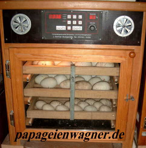 Brutmaschine: Hemel SK126 mit Computergesteuerter Feuchtigkeits- und Temperatur- Regelung und Wendeautomatik. Wird bei uns hauptsächlich zur Geflügelbrut verwendet. In NOTFÄLLEN wird die Maschine aber auch für die Kunstbrut von Papageien eingesetzt.