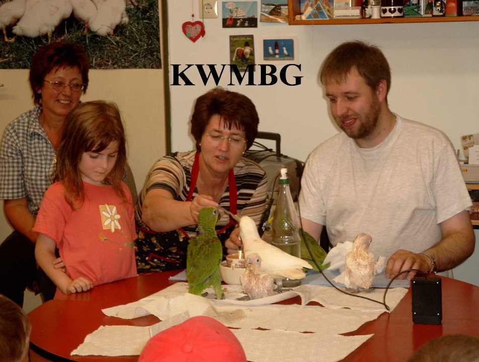 Am 17.06.2003 sind wir einer Einladung des Mengsberger Kindergartens gefolgt. Wir haben an diesem Tag den Kindern für eine Stunde unser Hobby "Die Papageienzucht" näher gebracht. Dabei durfte jeder der wollte unsere Babys einmal streicheln oder füttern. Dieses war mit Sicherheit eine lehrreiche Erfahrung sowohl für die Kinder als auch für unsere Vögel. Geschadet hat es keinem!!!
